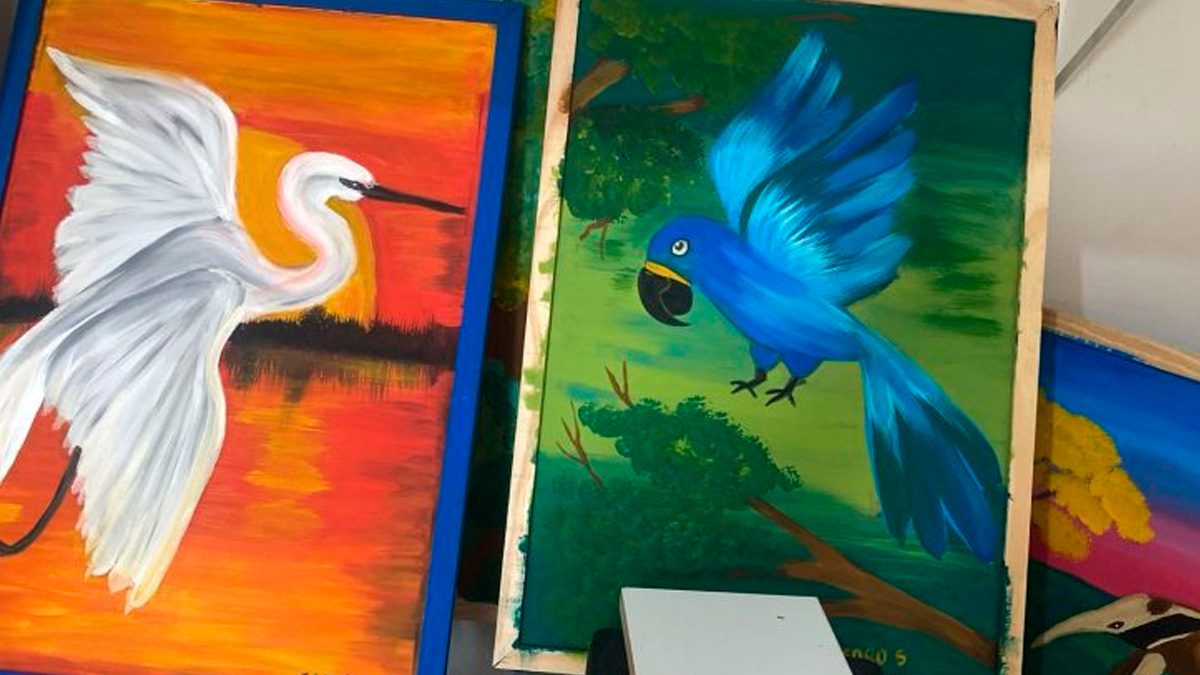 As telas foram desenvolvidas em aulas de arteterapia na Clínica Ressignificar, parceira do Bioparque na iniciativa, e revelam a sensibilidade e o talento desses jovens artistas ao retratar a fauna pantaneira.