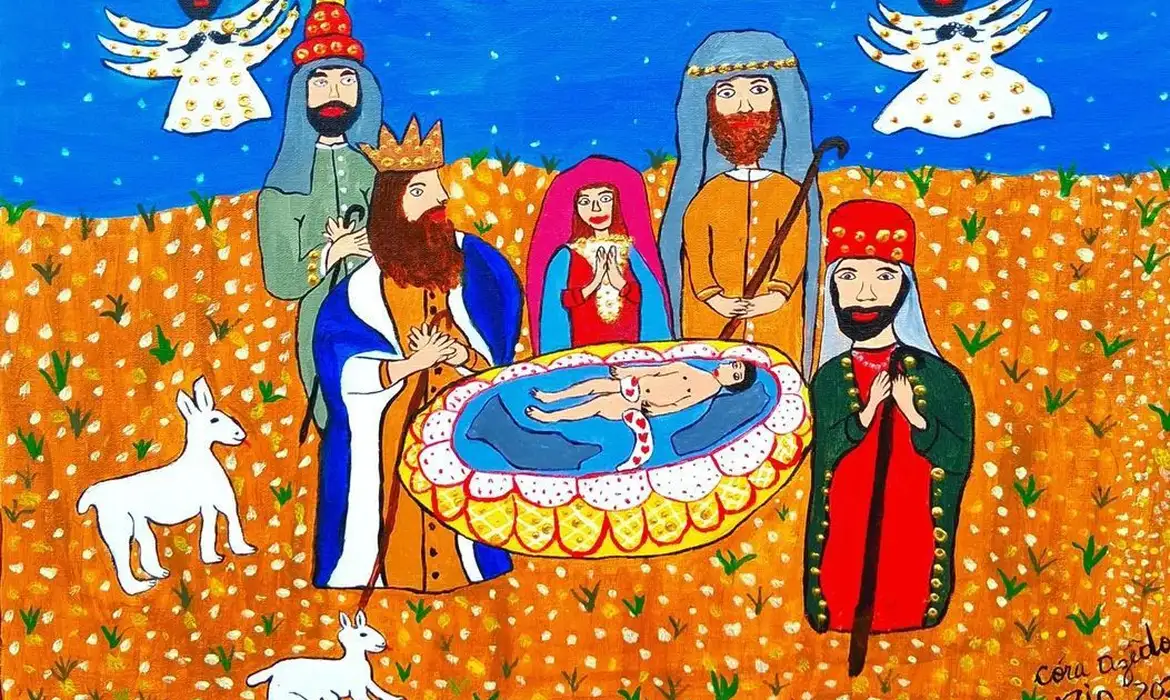 Outra homenagem aos presépios em 2025 surgiu da artista carioca Cora Azedo. Com cores vibrantes e anjos negros, ela criou a obra em acrílico sobre tela, cujo destino foi uma exposição de presépios em João Pessoa (PB). “Esse é o segundo presépio que eu faço”, comentou a artista, adepta do estilo naif.